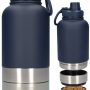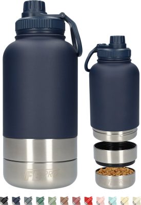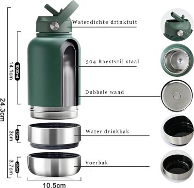 Dog water bottle with bowls – This multifunctional bottle combines a dog water bottle, a dog food bowl, and a thermos in one compact and stylish design – Ideal for long walks, travel, or days out with your four legged friend -Double-Walled stainless steel bottle – Robust and safe – BPA free and safe for your dog