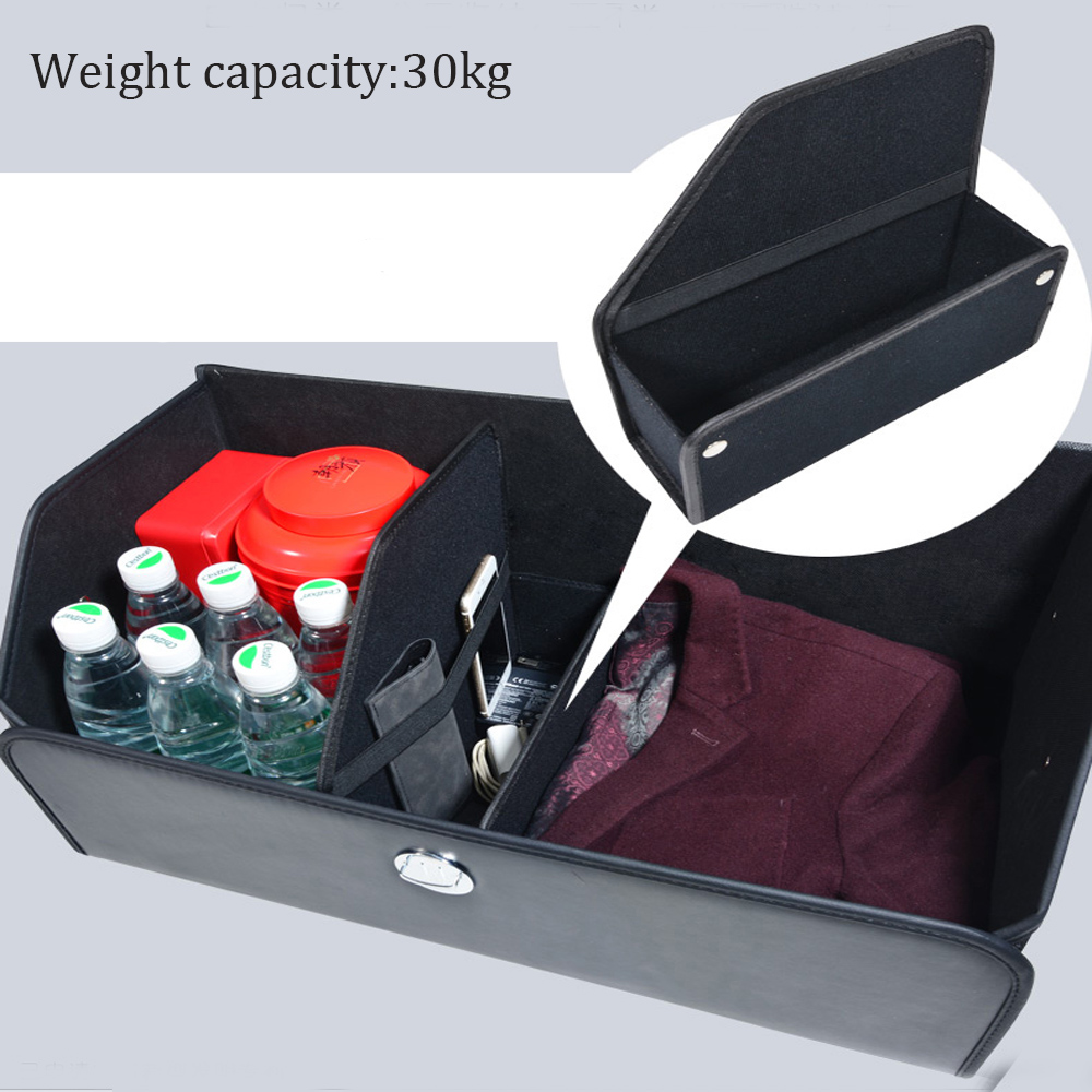 Foldable car storage bag in leather or PU leather-Non woven fabric and density board, easy to clean, water resistant and scratch resistant-Thicker alloy material is not easy to be damaged-Handle can carry 100 kg and option for lock or not