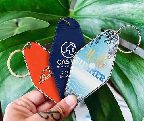 Custom motel keychains, also known as custom hotel keychains, can not only serve as room key identification tools, but also as effective promotional tools – The classic rhombus design originated from American motels in the 1950s and 1970s, with a strong sense of retro culture, bringing people back to the “golden highway era” at a glance -The most common size is 3.5 “x 1.75” for custom motel key tags, and we recommend 2.5 “for metal. Of course, we can also customize sizes to meet your different needs!