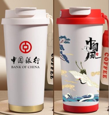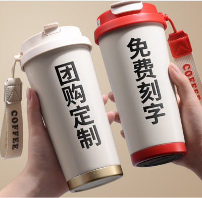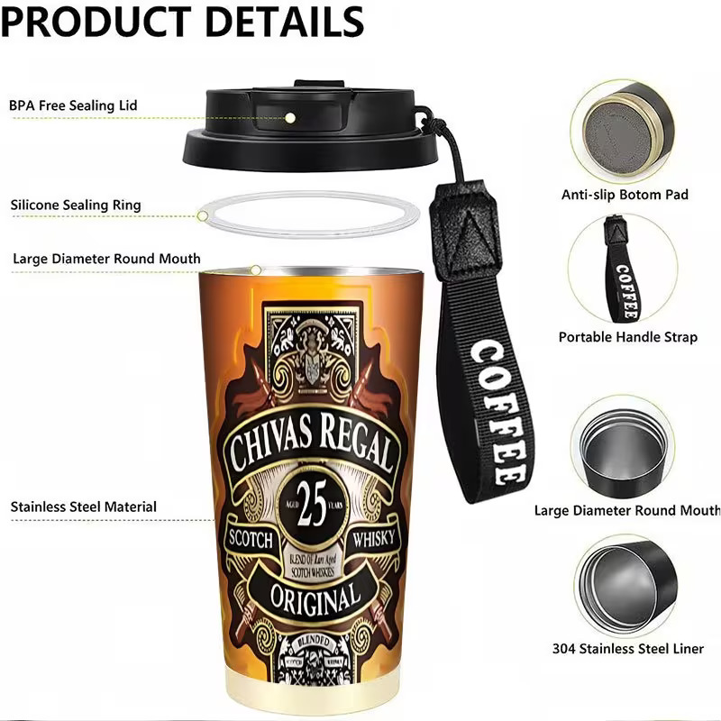 Double layer stainless thermal coffee cup in full color printing – Little hand strap included – For traveling , school and more