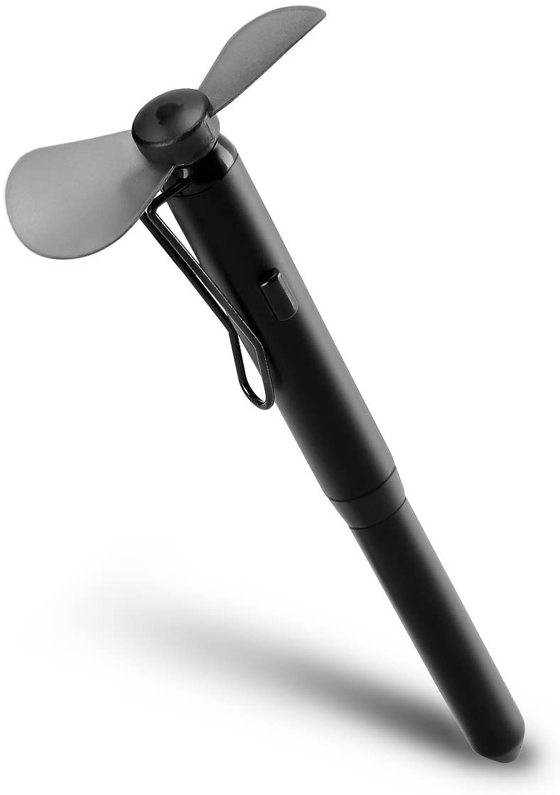 Brass ball pen with shiny chrome trim and a powerful built in personal cooling fan-With carbide ball for improved writing quality. Fan uses one AAA battery which is included and it is presented in a black gift box
