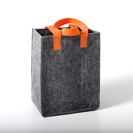 Bottles bag including handles made from polyester piping finishing-Convenient bottle bag made of grey felt for six bottles, with pocket partitions-No more bottle rattling