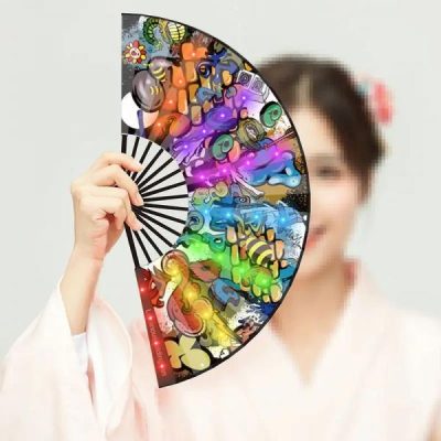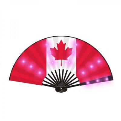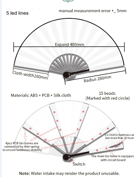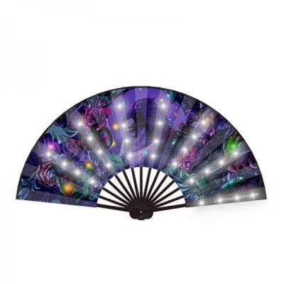 A luminous LED folding fan – handle color can be PMS customized – LEDs blink when we move the fan – Power supply: 2 x CR2032 batteries – Different LED options