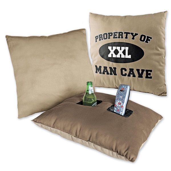 Two deep, insulated nylon pockets on the back perfect for holding a remote control and your favorite beverage-Its a mens pillow-Fun custom designs on the front-No place to keep your drinks or remote while you sit on the couch-The solution, can hold beverages and makes sure you never loose the remote again
