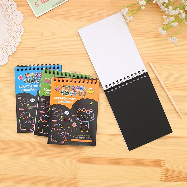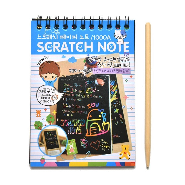 A creative way to create colorful notes and drawings-Scratch the black area to leave a rainbow colored message-Great to use at home or in the office -One notebook contains 10 pages of scratched paper and 2 page covers, 1 wooden scriber with your brand logo