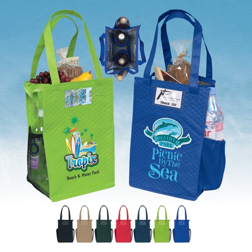 A zipper closure A 7 “side pocket Dual reinforced 18” handles Plastic bottom insert With your brand logo