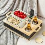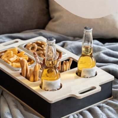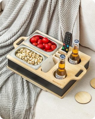 Organizer and bottle holder Good solution for stylishly displaying your snacks and drinks on the couch – Two stainless steel bowls hold enough snacks or a cozy evening on the couch – Completed with two drink holders and a split storage compartment where you can keep all kinds of accessories such as napkins, your remote control, or your mobile phone at hand